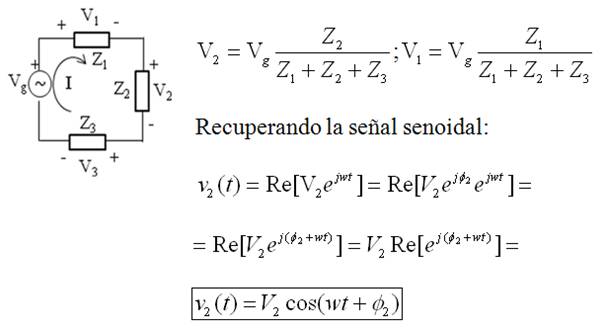 Aplicando la fórmula conocida del divisor de tensión al siguiente circuito se obtiene el fasor de la solución: