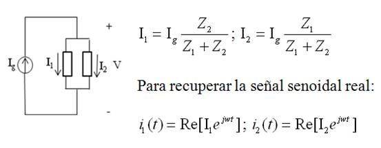 Aplicando la fórmula conocida del divisor de corriente al siguiente circuito se obtiene el fasor de la solución: